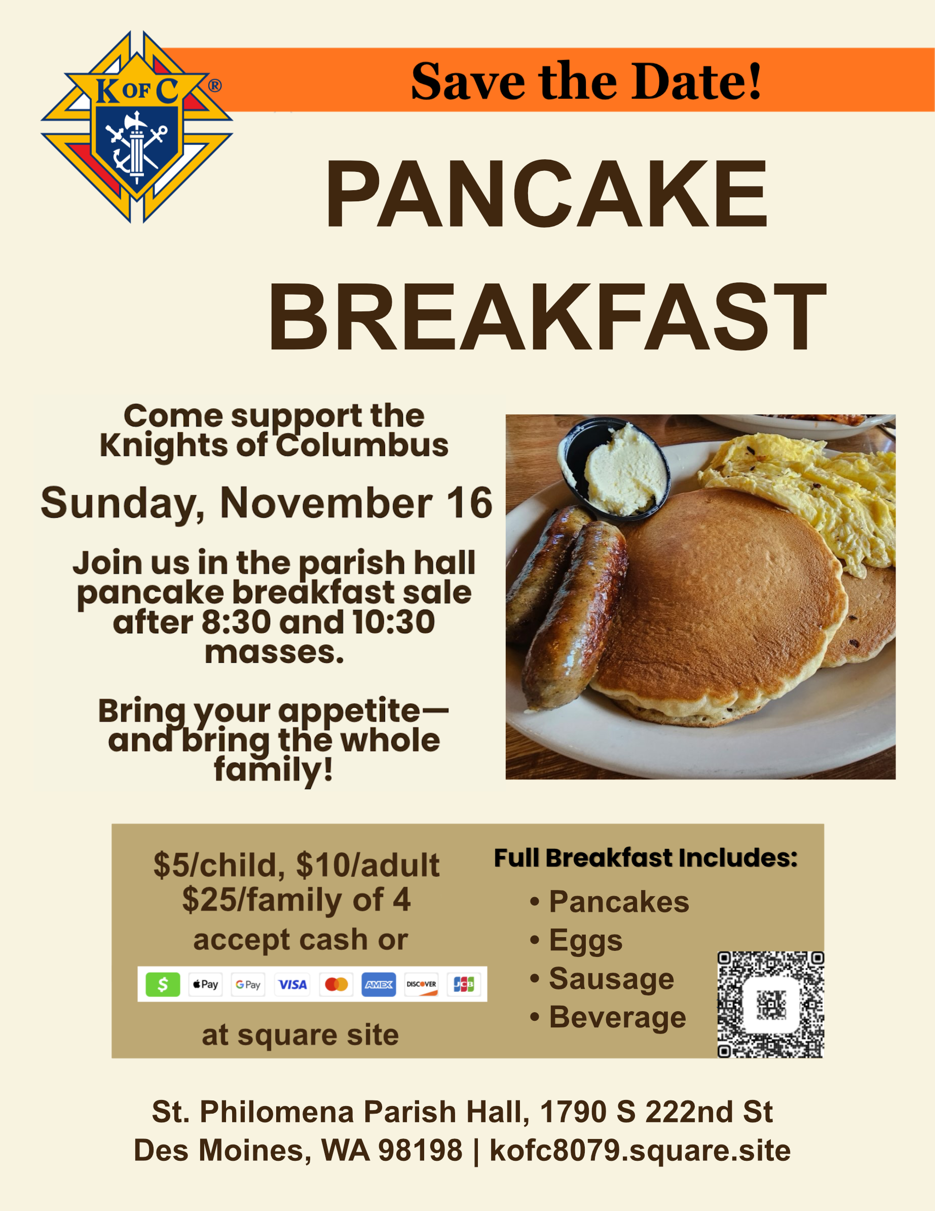 Breakfast, Sunday, November 16, after 8:30am and 10:30am Masses in Parish Hall. Prices on our square site are here, sign up to volunteer here, and the Breakfast Flyer is here.